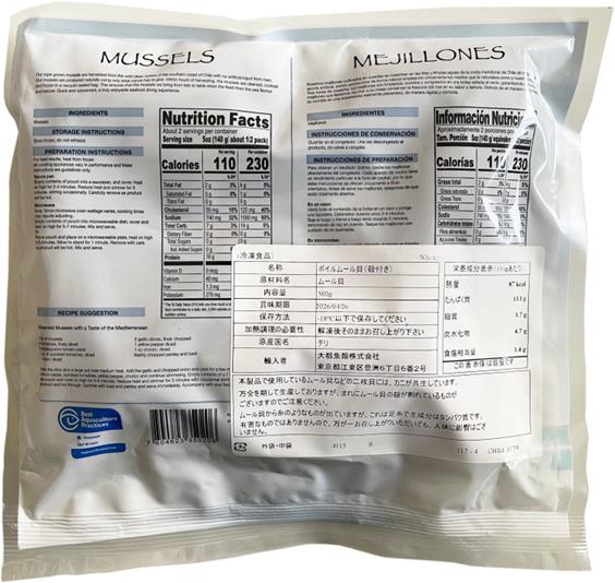 南米チリで養殖されたムール貝を軽くボイルし、鮮度の良い状態でパックし、冷凍した物。砂噛みや身痩せがなく、鮮度が抜群。ブイヤベースやパエーリャ、パスタのトッピングに最適。1パック約40個入り。